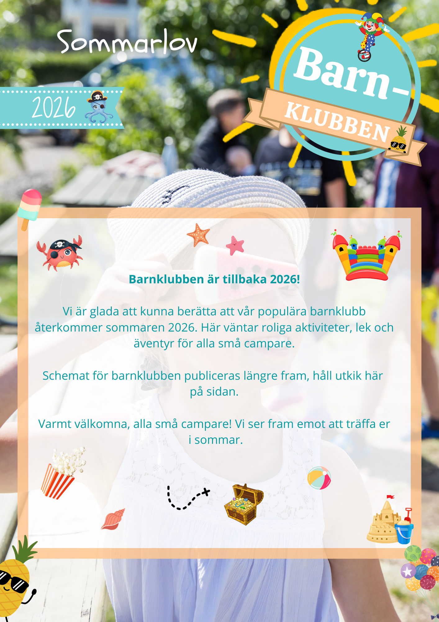 Vår Barnklubb erbjuder något för alla åldrar, från de allra minsta till äldre barn som är ute efter lite mer fartfyllda aktiviteter. Här får barnen chansen att träffa nya kompisar, utforska campingens omgivningar och delta i aktiviteter som är både roliga och lärorika. Varje vecka har vi olika teman, så det finns alltid något nytt att se fram emot!